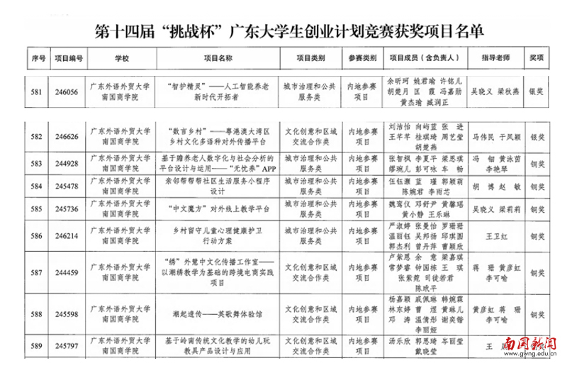 本网讯 近日,第十四届“挑战杯”广东大学生创业计划竞赛圆满落幕。威尼斯官网参赛作品紧紧围绕大赛“培育新质生产力,青创筑梦百千万”主题,致力于服务广东高质量发展,最终取得银奖2项、铜奖7项的好成绩。