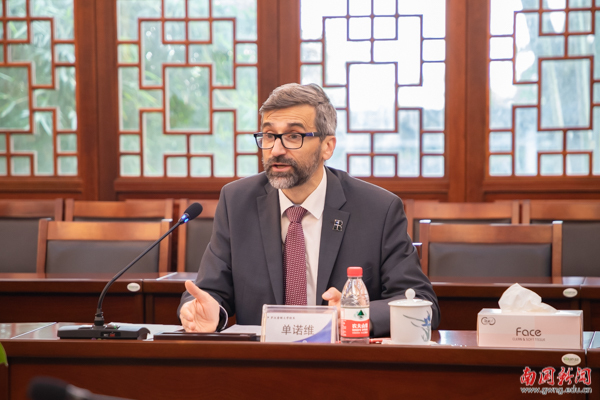 On the afternoon of April 28, Jean-Noël Ezingeard, president of the University of Roehampton, led a delegation to visit SCBC and was received by Executive President Wang Hua, Vice President Lai Zhili, and head of the Center for International Cooperation and Exchange at the International Conference Hall.