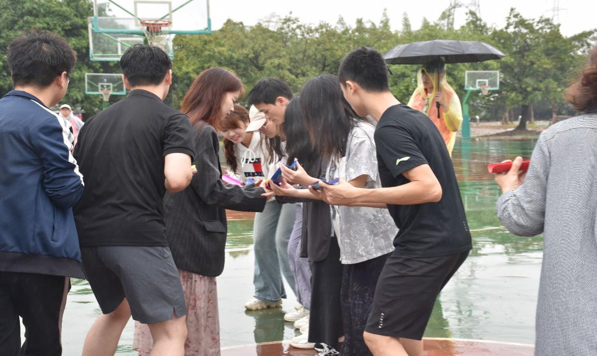 随着裁判一声令下,比赛开始,诸位老师迅速进入状态,有条不紊地传递着呼啦圈。时间一分一秒地流逝,比赛也进行到白热化阶段,我院教职工队伍加快速度,同心戮力,发扬团结精神,迅速又利落地传递着呼啦圈。在呼啦圈顺利地被传回最后一名参赛选手手中后,比赛宣告结束,现场爆发出热烈的欢呼与喝彩声。我院老师们激动地鼓掌、拥抱,尽管雨仍未停下,但每位老师脸上都洋溢着喜悦的笑容。