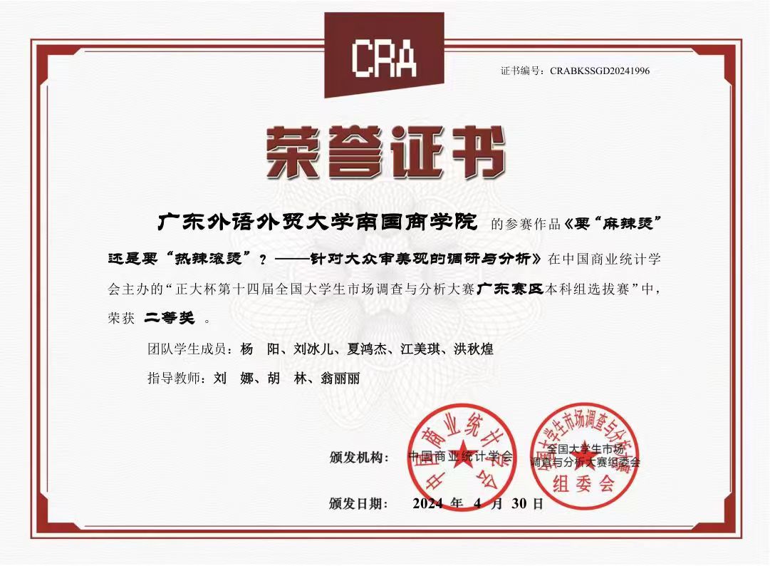 近日,“正大杯”第十四届全国大学生市场调查与分析大赛广东赛区选拔赛落下帷幕。我院由胡林、翁丽丽和刘娜三位老师指导的三支学生队伍参赛,分别取得广东省赛二等奖(两支队伍)、三等奖(1支队伍)的喜人成绩。