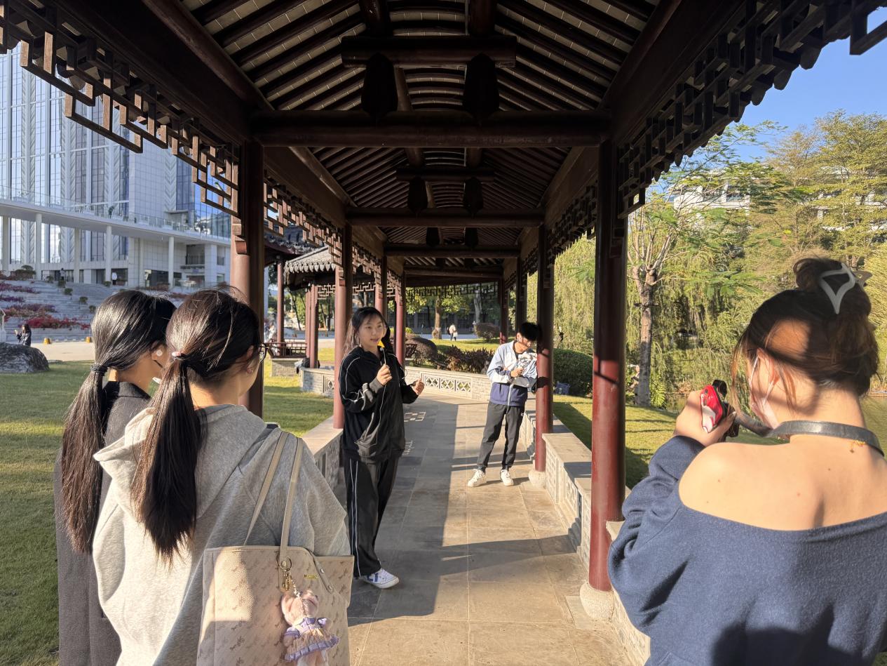 活动当天,师生们在学校充满寓意的校训石前集合进行大合照,拉开此次活动的序幕,学生领队高举导游旗,带领“游客们”游览南国商学院的建筑和景观,学生导游为“游客们”讲解了南国商学院校训石、南园、节园、醉翁亭、不孤亭、日月湖、绿色生态基地、莲花池、茉莉茶舍等景点的历史故事和建设意义。力求通过模拟真实的导游场景,让学生在实际操作中巩固所学知识,提升综合素质。