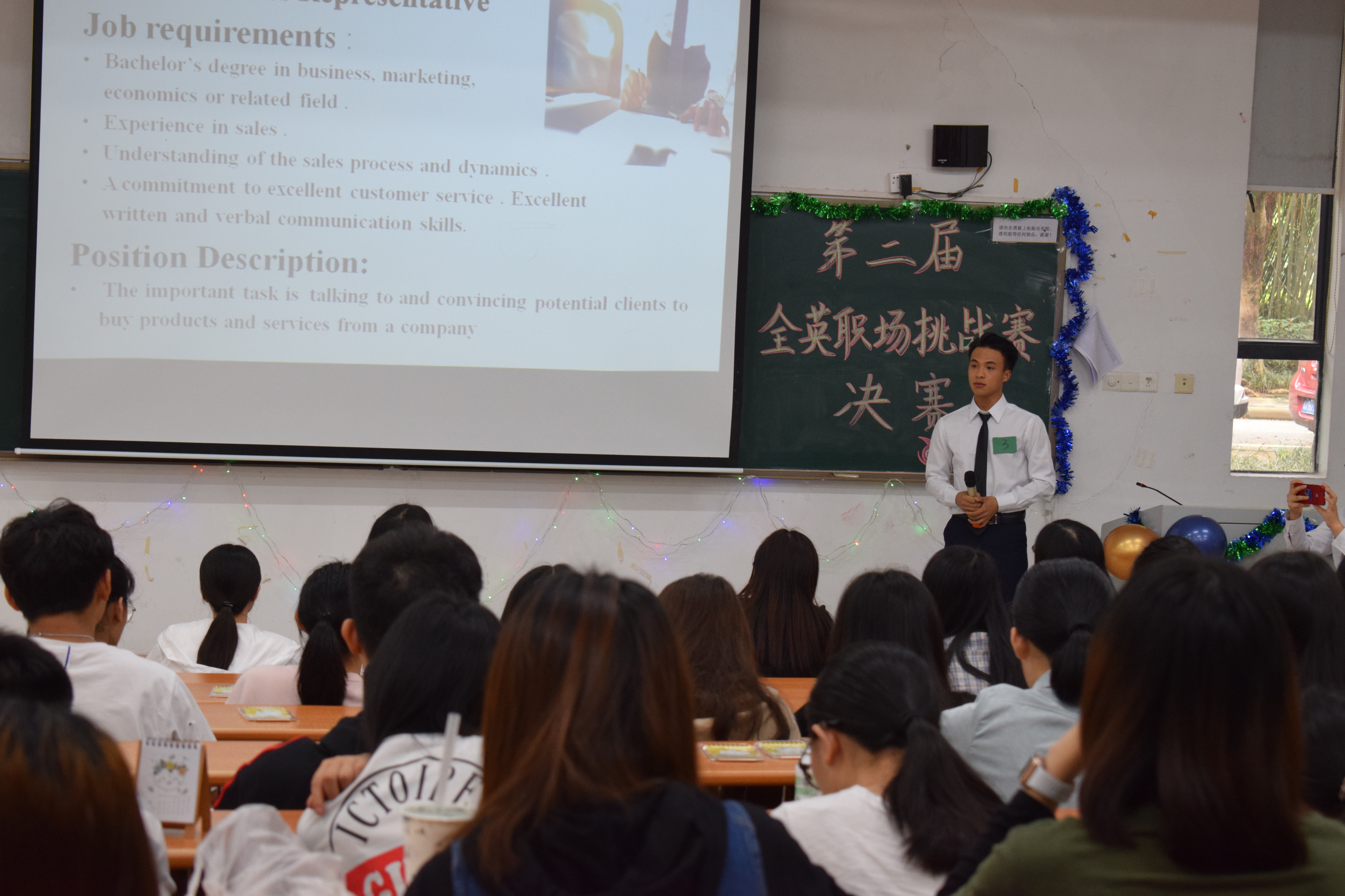 本网讯 5月9日14:00,英文学院第二届全英职场挑战赛决赛在课室G栋107举行。本次比赛由英文学院副院长胡红玲、商务英语系主任尹雪艳老师、谢真老师、蒲萍老师担任评委。共有8位选手通过初赛选拔进入了决赛。